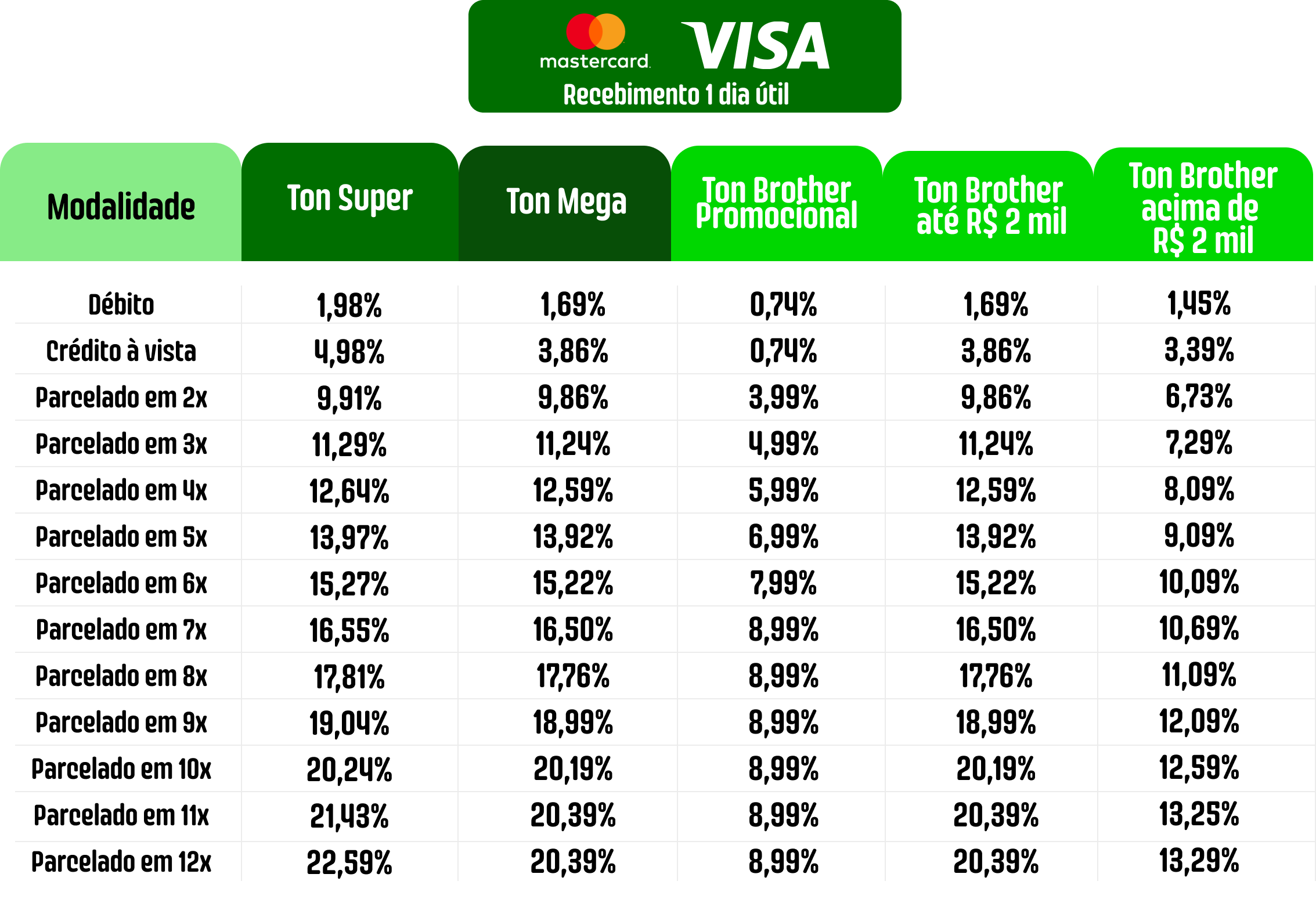 No plano Ton Mega e Ton Super, as maquininhas têm preços mais baratos e as taxas não mudam de acordo com as suas vendas mensais.